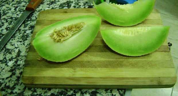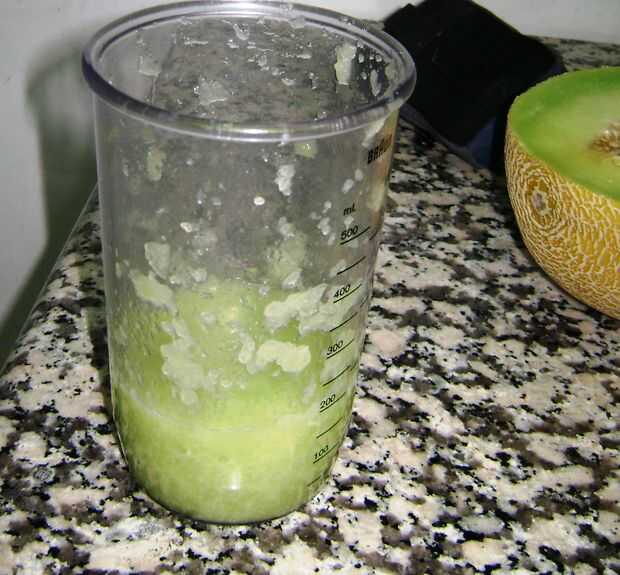 Para ello, cortar una rebanada grande de melón (como 1/5 o 1/4 de melón entero), pelarlo y moler hasta que quede un poco más líquida que la confitura o mermelada.