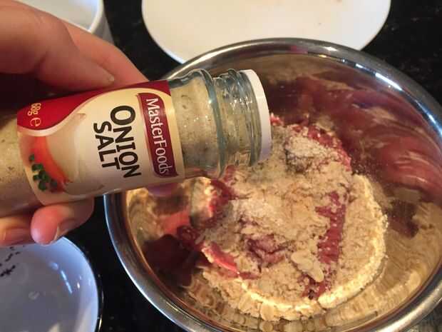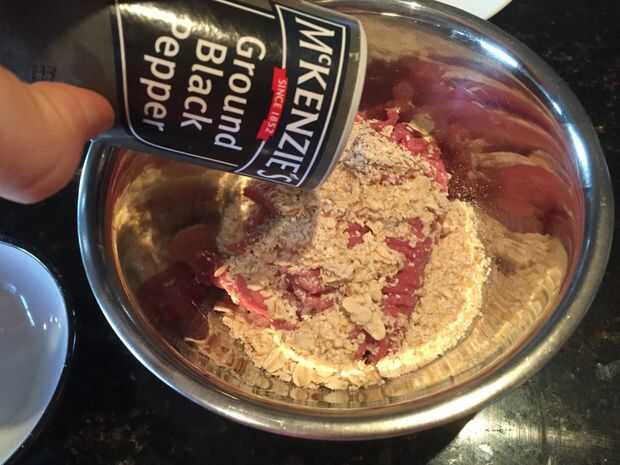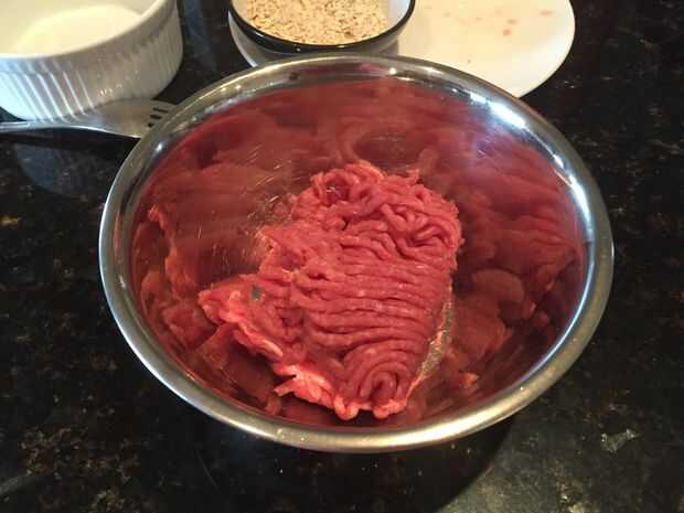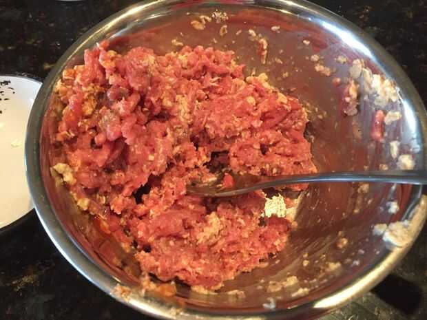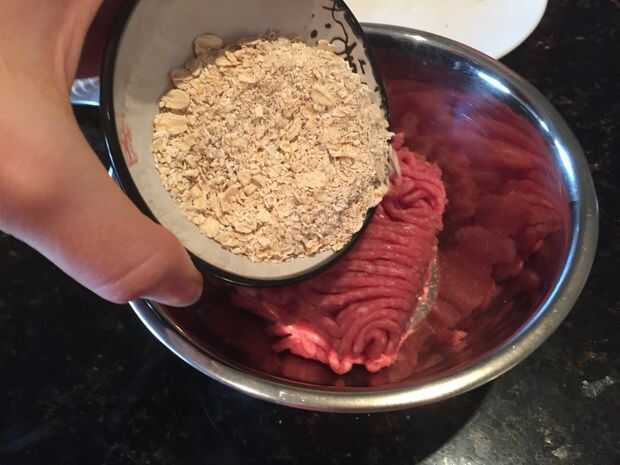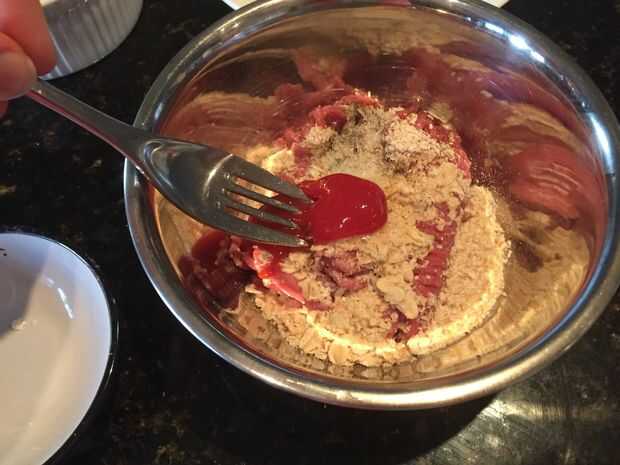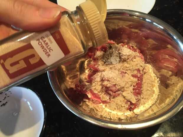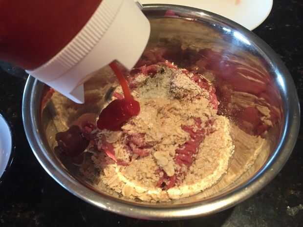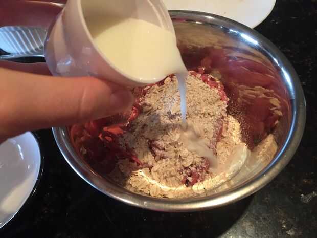 Así que esta receta no podía ser más simple (¡ me encanta recetas fáciles!). Primero colocar la carne picada en su recipiente y añadir la leche y avena de cocción rápida. Luego agregar todos los condimentos secos y tu salsa preferida.