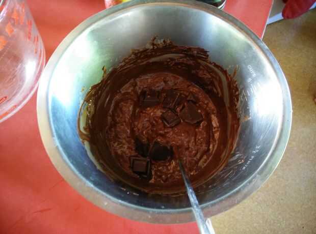 Colocar los botones de chocolate en un bol sobre un recipiente de agua caliente para derretir. Se trata de su torta de cemento de construcción.