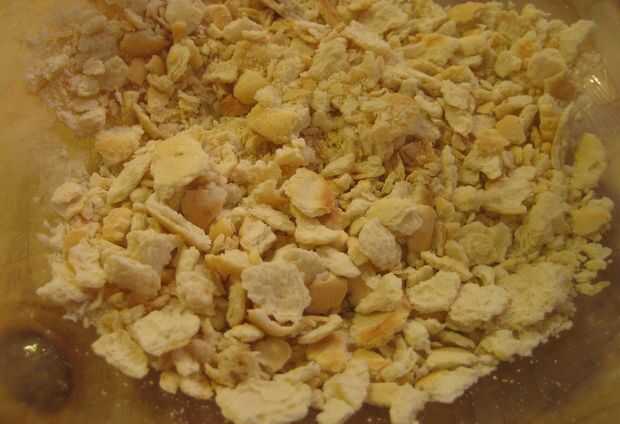 1. Desmenuzar las galletas en tazón y añadir el agua, permitiendo que las migas de galleta empapar para arriba