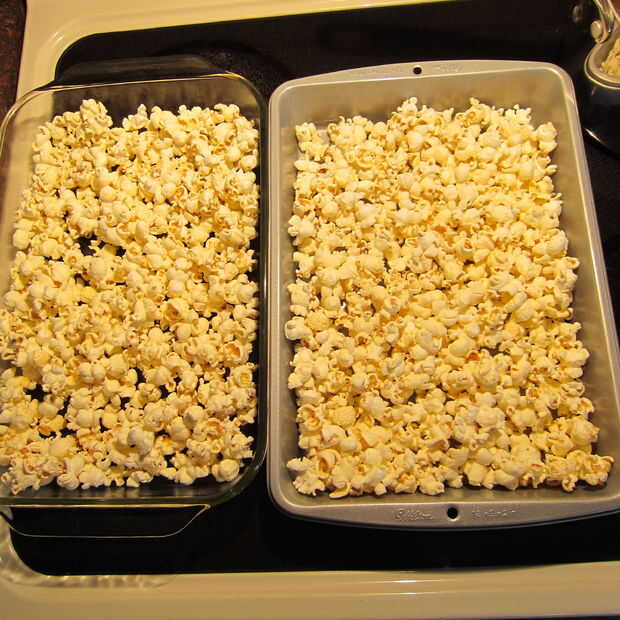 Pop 4 cuartos de galón (16 tazas) de palomitas de maíz y dividir igualmente entre dos moldes de 9 x 13 ligeramente untado con mantequilla asegurándose de que hay núcleos de la izquierda. Uso mis manos después de hacer estallar el maíz y ponerlo en las cacerolas de la hornada dejando los granos sin palomita en la parte inferior del recipiente. Es ninguna diversión para romper su diente en un núcleo de palomitas de maíz así que Tómese su tiempo haciendo esto!