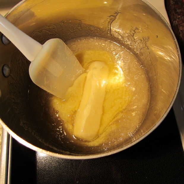 Combine la mantequilla, azúcar, sal y jarabe de maíz (trate de conseguir el jarabe de maíz que no tiene que HFCS) en una cacerola mediana. Poner a hervir sobre fuego medio, revolviendo para mezclar. Una vez que la mezcla comience a hervir, hervir durante 5 minutos a fuego medio revolviendo constantemente.