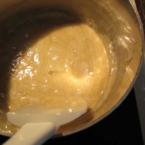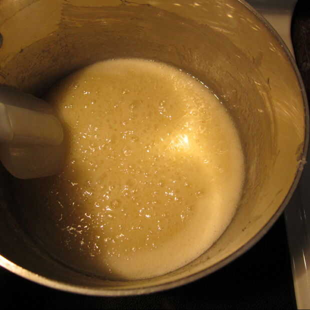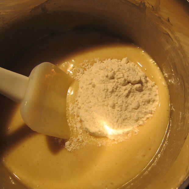 Retire del fuego y agregue el bicarbonato de sodio, la mezcla de torta y la vainilla. La mezcla será ligera y espumosa.