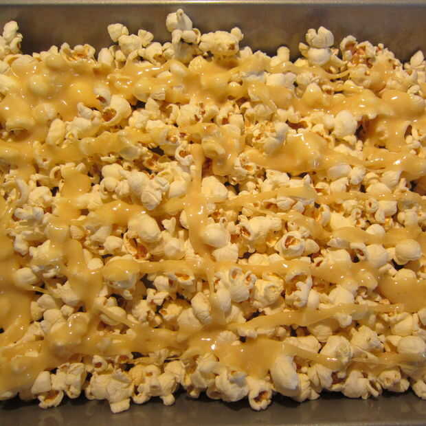 Después de una hora sacar bandejas del horno y continuar revolviendo suavemente las palomitas de maíz hasta que se enfría lo suficientemente para que no se queda en grandes grupos.