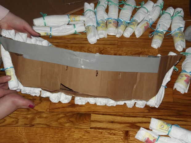 Entonces uno por uno, pegar cuidadosamente en sus laminado en pañales. Cuando usted consigue un lado hecho, tomar una super larga duración de la cinta y "cosa" entre cada uno de los lazos de la mercadotecnia a lo largo de la parte superior e inferior.