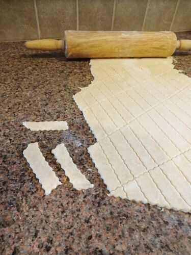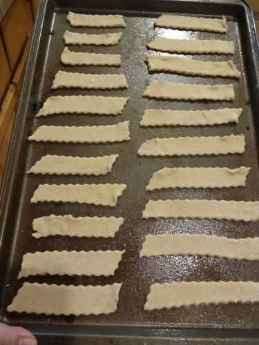 Cortar varios tamaños de papas fritas del pastel de masa de la corteza y colocarlos en una bandeja engrasada.