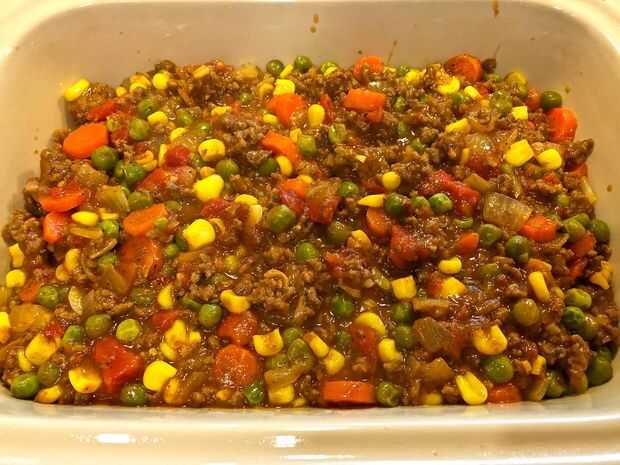 Mezcla de carne de cuchara uniformemente en una cazuela para hornear de 2 cuartos.
