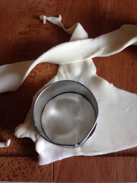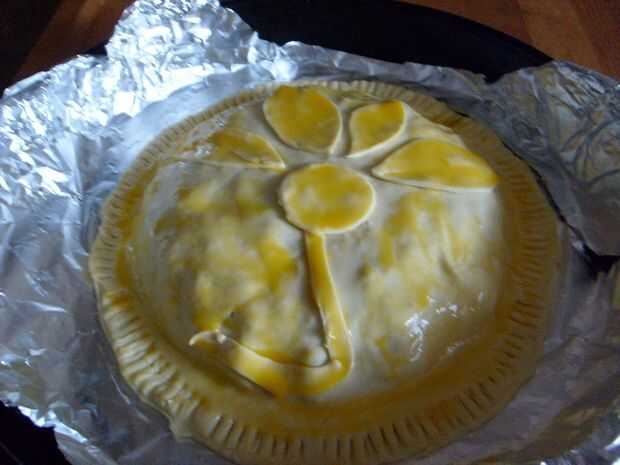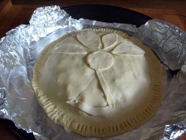 Decorar la parte superior con corte izquierda sobre pasta y cepillo de la parte superior con huevo batido.