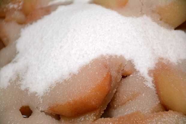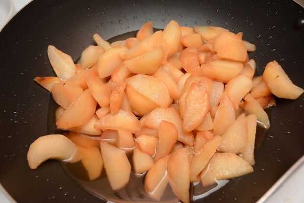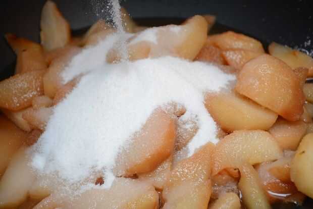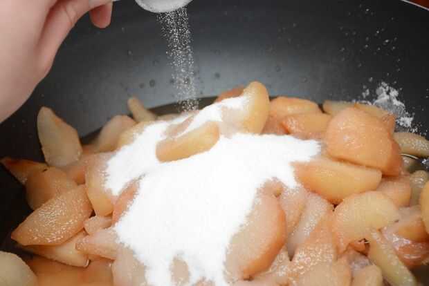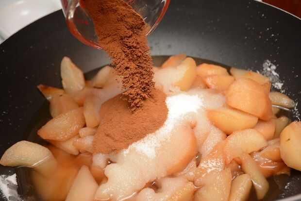 Vierta las peras dentro del wok. Añadir el azúcar y la canela. Poner el wok en la estufa y gire el dial (Asegúrese de girar el uno para el quemador que usted está usando) a fuego medio.