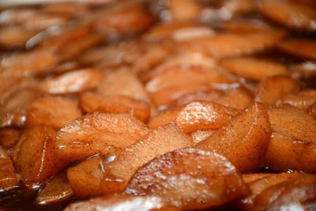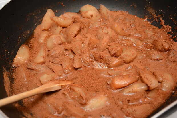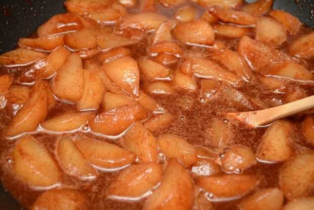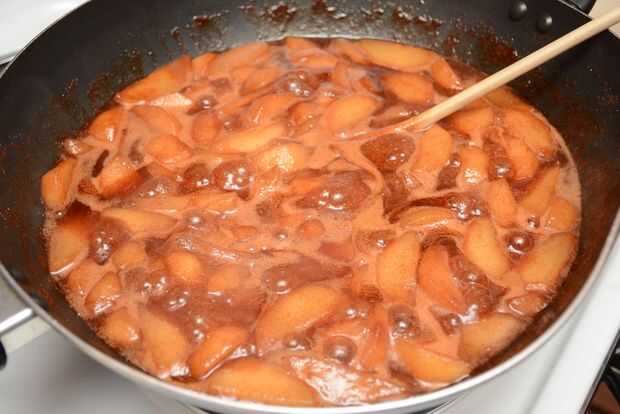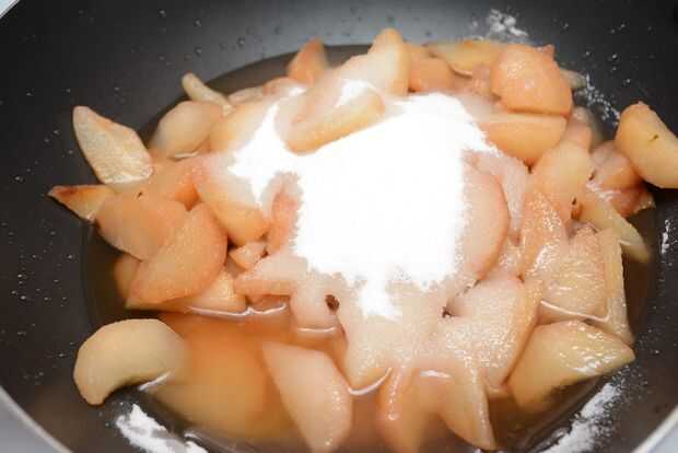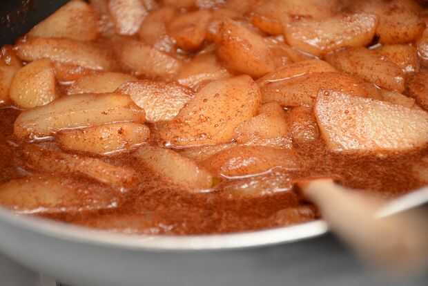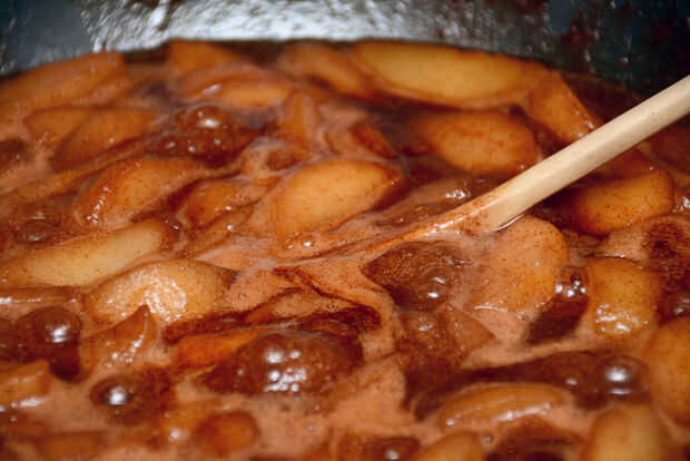 Remover el relleno hasta que las peras están cubiertas completamente. Cuando el relleno comienza a burbujear un poco, subir el calor hasta medio alto, revolviendo hasta que el líquido comience a hervir lento, luego dejarlo hervir de tres a cinco minutos. Retire el relleno del fuego y vierta cuidadosamente en la cazuela.