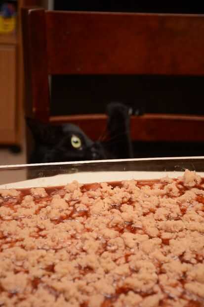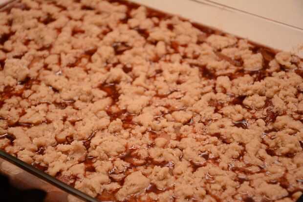 Desmenuzar la masa resultante entre sus dedos sobre el zapatero. Tratar de difundir algo uniformemente sobre el relleno. La mejor manera que he encontrado para crumble el crumble es colocar el crumble entre sus dedos y frotarlas.