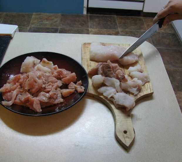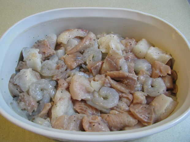3. cortar el pescado en trozos pequeños. Coloque el pescado y shimp en un bol.