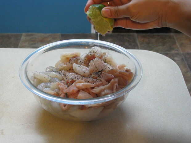 5. Espolvoree el pescado y el camarón con jugo de limón y colocar en la base del plato preparado.
