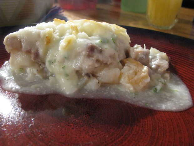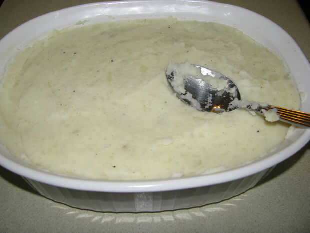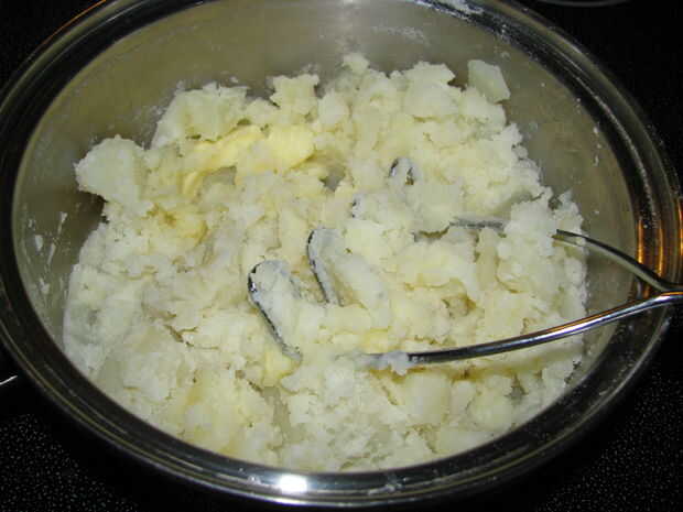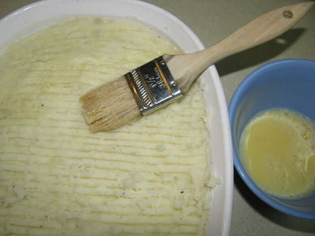 2. Vierta el puré de patatas encima de la mezcla de pescado y suavizar con la cuchara.