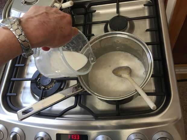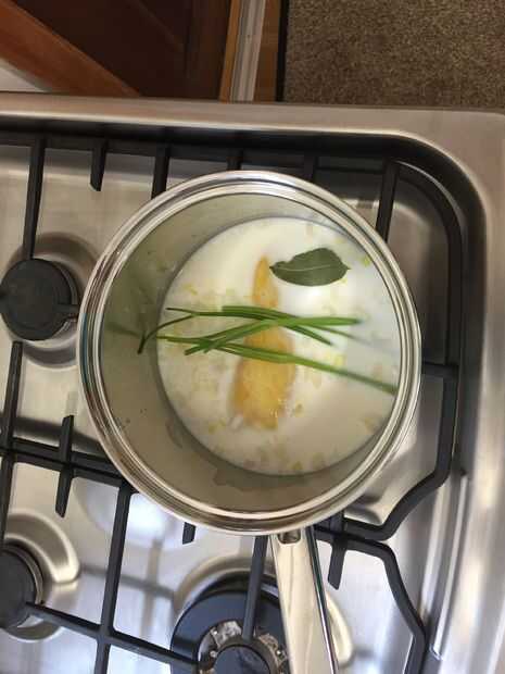 Calor la leche suavemente con una hoja de laurel, algunos cebolla, perejil los tallos durante unos 5 minutos. Colar y volver a la bandeja.