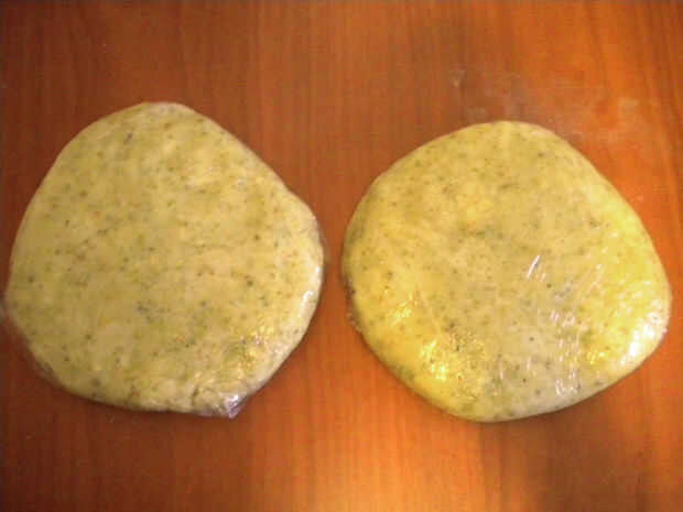 Picar los pistachos y luego toque el recipiente para separar los pedacitos más grandes de los pedacitos más finos. Dejar de lado las brocas más grandes para usar como topping más adelante. En un medio tazón combine las nueces, la harina, el azúcar y la sal. Agregue la mantequilla y mezclar hasta que la mezcla forma pequeños trozos del tamaño de garbanzos. Agregar agua fría 1 cucharada a la vez y mezcle hasta que esté apenas húmedo suficiente para unir. Formar una bola de masa, dividirla en dos, envolver cada bolita con un envoltorio plástico y aplanar en discos. Refrigere por al menos una hora antes de rodar hacia fuera y para hornear. Masa puede almacenarse durante 3 días en heladera o 2 semanas en congelador.