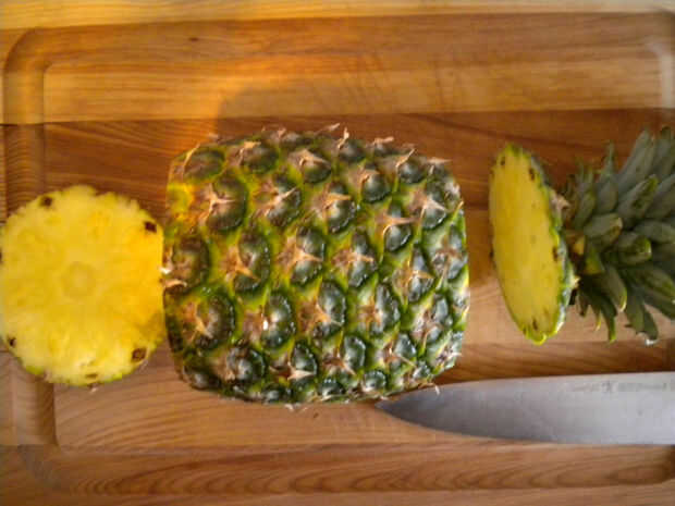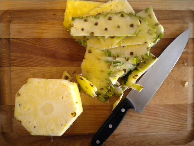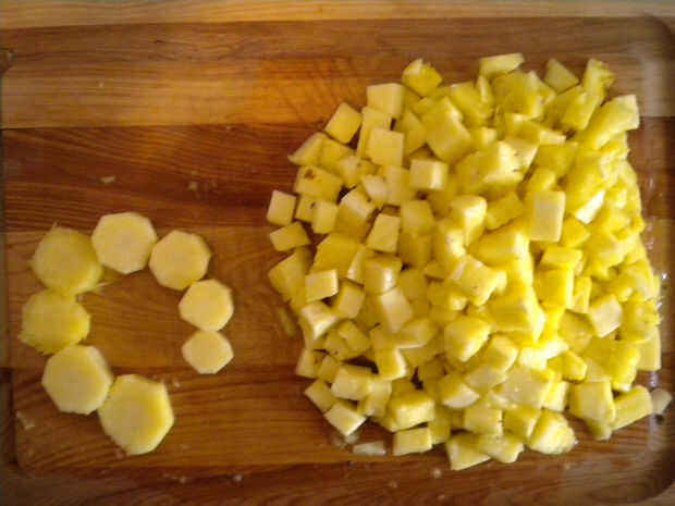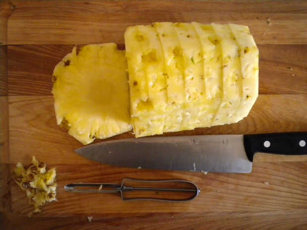 La mitad de la piña cortada en cubos pequeños y la otra mitad en la licuadora hacer un puré. Poner el puré en un colador o lienzo limpio sobre un tazón con una goma para sujetar la tela y dejar drenar el jugo sobrante durante 10 minutos. Mientras que el puré está drenando, Pele el limón y exprimir el jugo. En una olla combine la piña en trozos, puré, azúcar, cal jugo y ralladura, vainilla, nuez moscada, canela, mantequilla y sal y revolver. Mezclar la maicena con 1/2 taza de la izquierda sobre jugo de piña y luego añadir la mezcla de maicena a la mezcla de piña y revolver bien. Poner a hervir y luego cocinar a fuego lento. Cocer durante 30-45 minutos, revolviendo ocasionalmente hasta que la textura se parece a la mermelada. Quite de calor, frío y puesto a un lado.