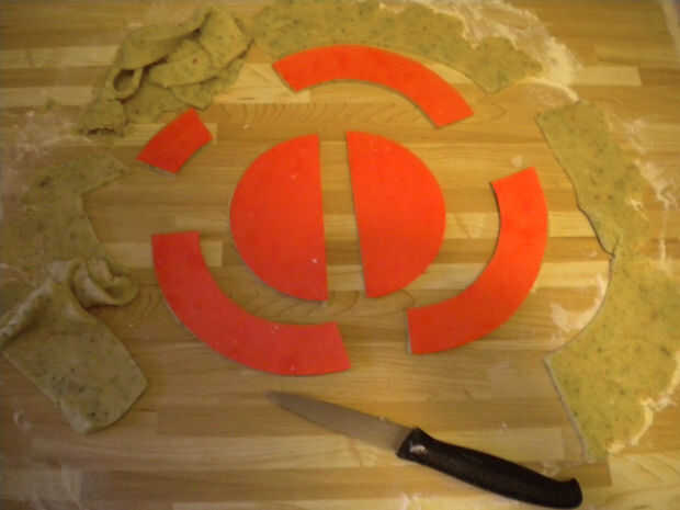 Quitar discos y les permiten sentarse a temperatura ambiente durante 5-10 minutos ablandar. A la forma a la parte inferior del rollo de pastel un disco sobre una superficie de trabajo enharinada hasta aproximadamente 12 pulgadas de diámetro y sobre â de pulgada de espesor. El rodillo desde el centro y gire la corteza ligeramente para evitar que se pegue. Suavemente doblar por la mitad y luego en cuartos la corteza y transferir a la tartera de 9 pulgadas y presione hacia abajo suavemente para líneas del fondo y los lados de la cacerola. Recortar los bordes, dejando sobre una 1/2 pulgada de la proyección y luego doblan los bordes bajo para hacer el borde. El sujetador de la corteza en el borde con el dedo pulgar y dedo índice para prensar el borde. Cubra con envoltura de plástico y refrigere durante 30 minutos. Tomar la segunda bola y rodar hacia fuera como el anterior. Cortar las formas, poner en una tabla de cortar enharinada, retire el papel, cubra con envoltura de plástico y refrigera durante 30 minutos. Si lo desea puede dab la parte superior con un huevo batido mezclado con un poco de leche o agua (hará que el borde y formas brillantes y oro) antes de poner en la nevera para que endurezca.