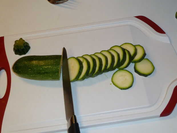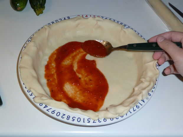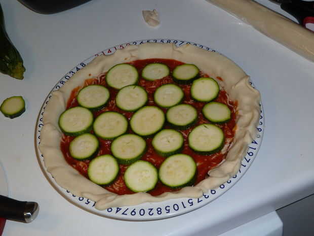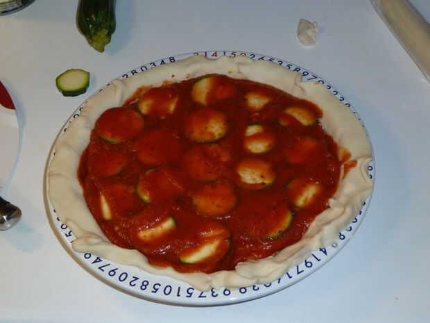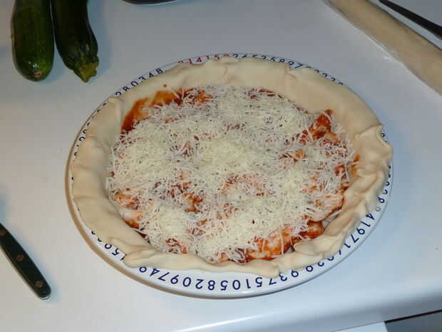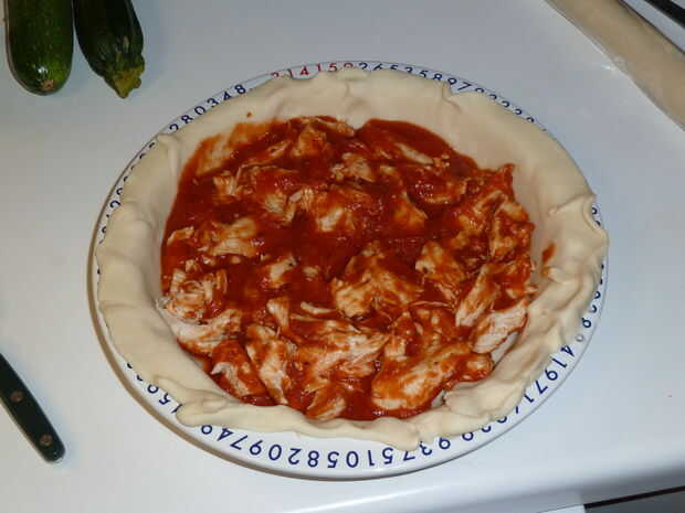 Un poco de la salsa para espagueti en la parte inferior de la corteza de la cuchara y extenderlo alrededor de-3 o 4 cucharadas deben estar bien. He utilizado un recipiente separado para combinar el pollo y la salsa, pero sólo puede hacerlo en el fondo de la tartera. Mezcle un poco y luego difundirlo alrededor en la sartén, para que el pollo forma una capa completa. No usé bien el pollo. He añadido un poco más de salsa, una vez el pollo en la sartén, para la buena medida. Entonces espolvoreado de queso italiano. Fue alrededor de 1 taza. Añadir un poco más de salsa - difundirlo alrededor con el dorso de la cuchara, suavemente o el queso solo se pegará a la cuchara. Luego lavar y cortar el calabacín y colocar en una capa sobre la parte superior del queso. Añadir alguna salsa más - he encontrado si no agrego suficiente salsa a la capa de calabacín, se quema, así que tenlo en cuenta.