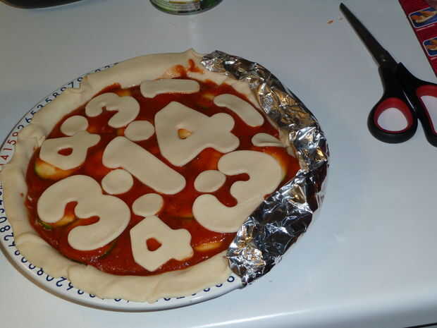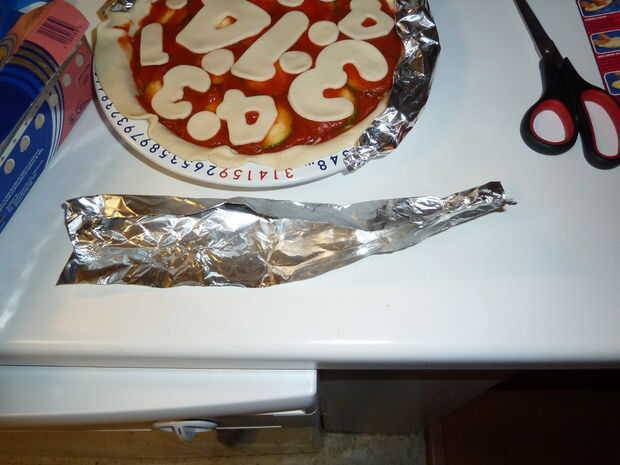 Use papel de aluminio para cubrir los bordes de la tarta - esto para evitar que se quema, ya que es más delgado que el resto de la tarta. Me pareció la manera más fácil de doblar el papel en tercios; envuélvalo alrededor del borde con 2/3 encima de la corteza y 1/3 en la parte inferior del labio de la cacerola. No en secciones y luego donde cada sección cumple, pellizcar el papel juntos. Que debe mantenerse bastante bien así.