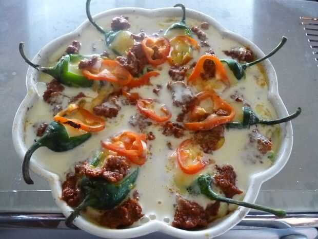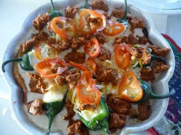 Organizar los jalapeños rellenos alrededor de la sartén. Superior con otro 3/4 taza de queso rallado. Añadir el chorizo restante y pimientos en cubos.