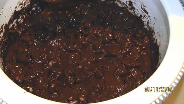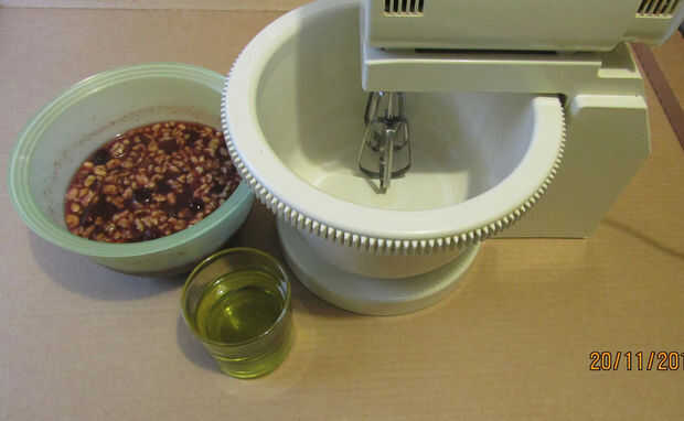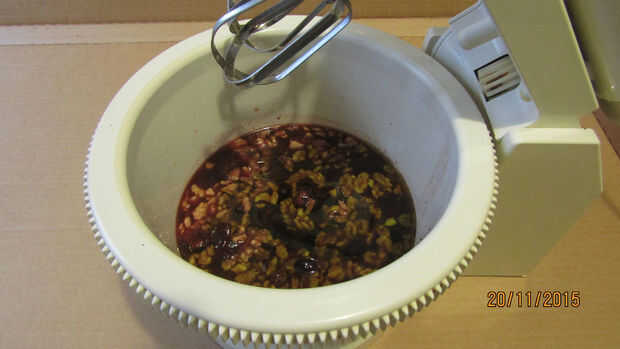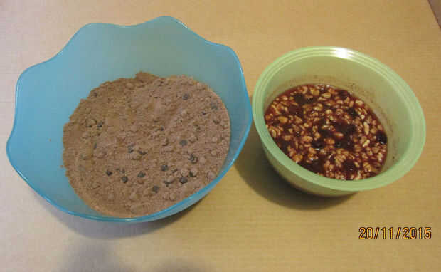 Vierta en el tazón de la batidora la mezcla primera del tazón de fuente (líquidos), iniciar la batidora a velocidad media baja y verter en una cuchara con una cuchara los ingredientes del segundo tazón de fuente (seca) hasta que todos combinan bien. Mezcle por otros 2 minutos.