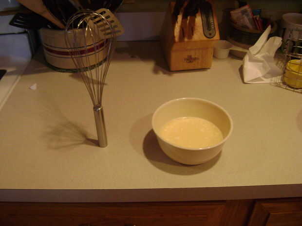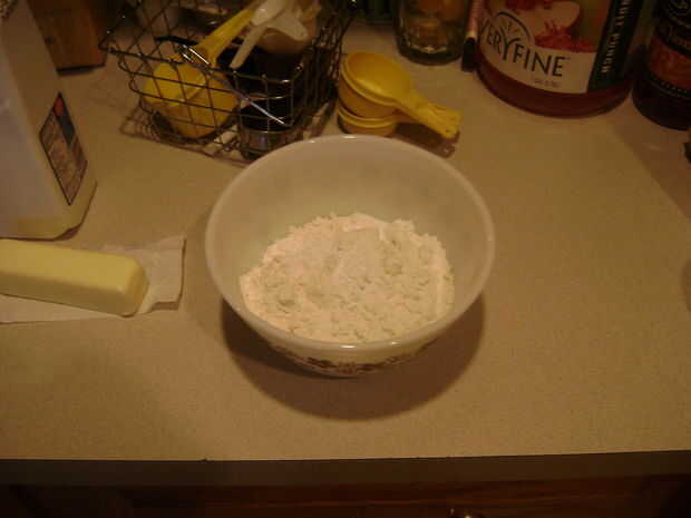 Mezcle la harina, polvo de hornear, sal y azúcar en un tazón. Luego precalentar el horno a 400 grados F. Luego frote la mantequilla en el molde para pasteles de 8 pulgadas y dejarlo en poner la bandeja en el horno para que se derrita la mantequilla. Una vez que la mantequilla se ha derretido en el horno la sacar y verter en otro recipiente junto con el batido de la leche y el huevo.