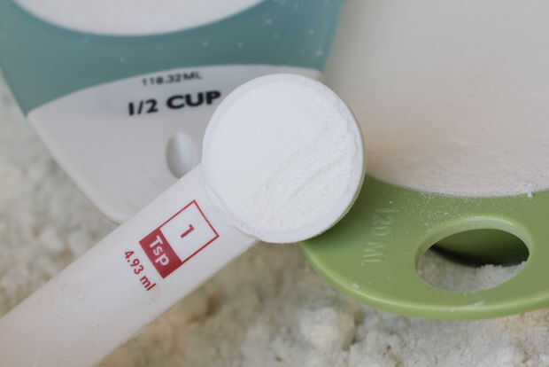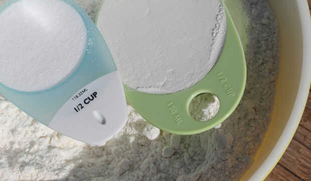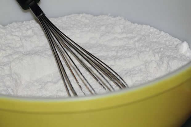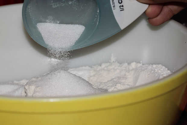 En un bol agregar la mezcla de pastel. Agregar: 1/2 taza de harina 1/2 taza de azúcar 1 cucharadita de polvo de hornear Utilice un batidor para mezclar todos los ingredientes secos.