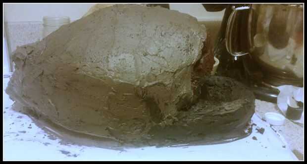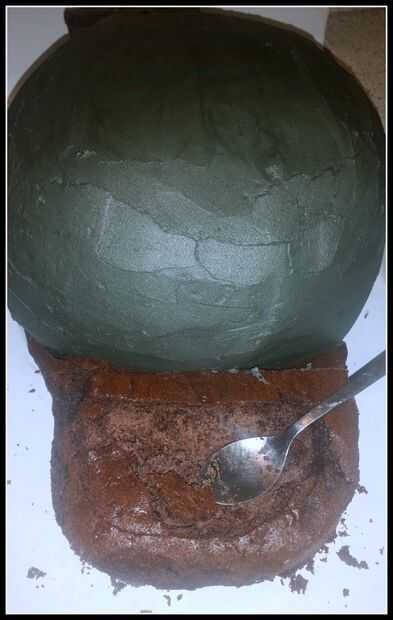 • Coloque la parte inferior en la mitad y tallado una forma redonda y con pastel para hacer un boca.