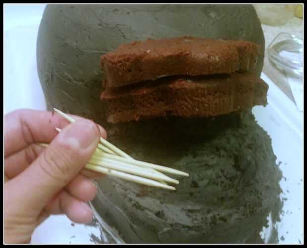 • Use la otra mitad de torta para hacer la capa superior de la boca. Corte esta la mitad dos pedazos. Uso de palillos y pastel de madera ayuda para extender la pieza de boca sobre la boca inferior formado.