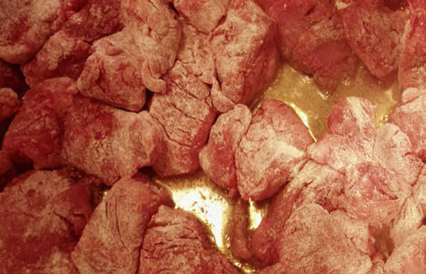 2. mientras el salteado de verduras, cubrir su estofado de carne ligeramente en la harina. Agregar unos trozos a la vez, dar una sacudida ligera, saque de la bolsa. Añadir la carne de vacuno a la cacerola y marrón hasta que ya no rosa. Sal y pimienta a tu gusto.