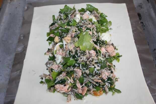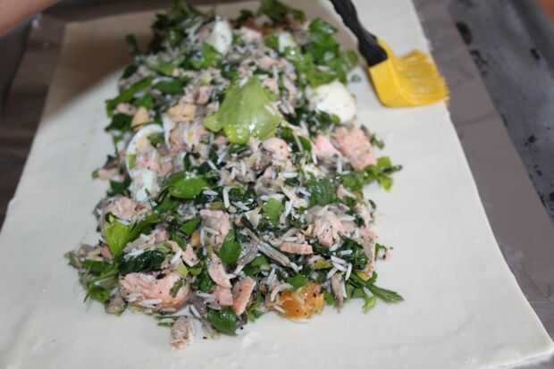 Estirar la masa y cortar dos rectángulos. Una 20 x 28cm, lo otros 31 x 24 cm. Ponga el pedazo más pequeño en una bandeja de horno. La mezcla de salmón en el centro de la pila, use sus manos para formar una forma agradable y pan forma dejando un espacio de al menos 2cm el borde redondo. Batir el otro huevo y cepille los bordes de la base de la pastelería.