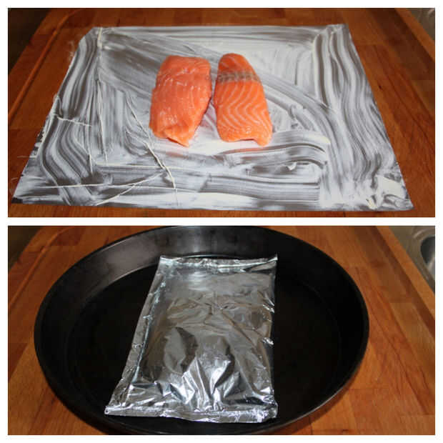 Engrasar un pedazo grande de papel de aluminio. Poner el salmón en el papel de aluminio y plegar en un paquete con los bordes firmemente sellados, dejando suficiente espacio interior para el circulación de aire. Poner en una bandeja de horno y hornear durante 20 minutos en el horno precalentado.