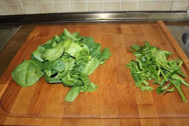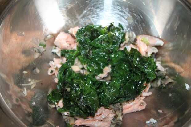 Corte los tallos y espinacas limpias. Calentar el resto de la mantequilla y cocinar las espinacas, revolviendo suavemente hasta que ablande y añadir a la mezcla de salman.