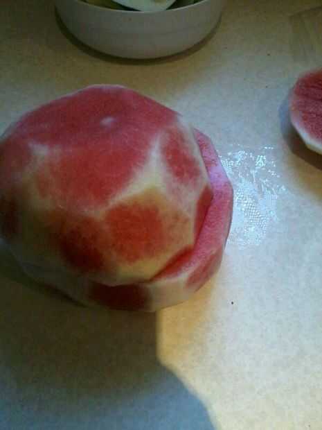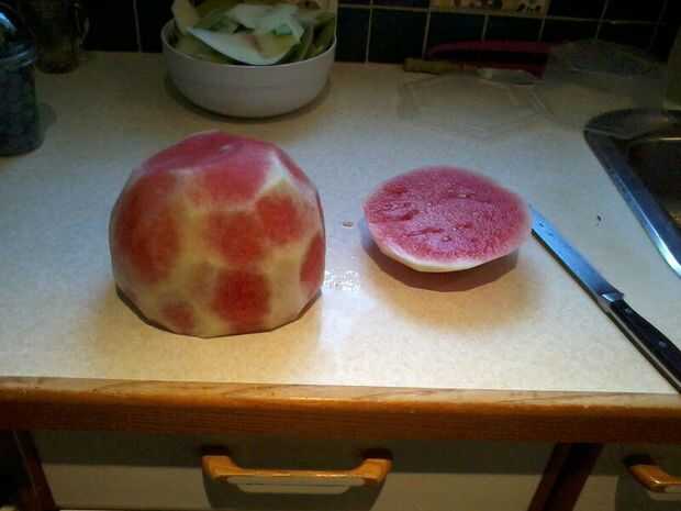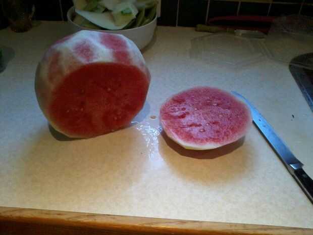 Muy bien... ¿Nuestro melón es todavía nervioso y no tiene agradable forma de pastel, correcta? Y todavía hay algunas manchas blancas.