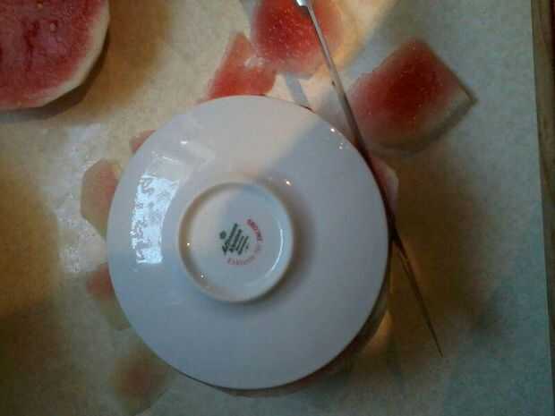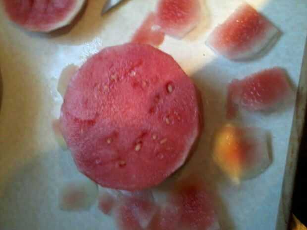 Las dos piezas que nos han cortado ahora se pueden dejar de lado. Utilizará más adelante para los cubos de sandía. Si no desea que los cubos, puede comerlos por supuesto.