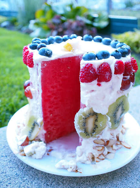 Crema batida casera, espesa cubre una jugosa sandía madura y está adornada con sabrosos frutos secos y bayas. Este no hornear pastel no requiere casi ningún esfuerzo y tiene un aspecto fantástico.