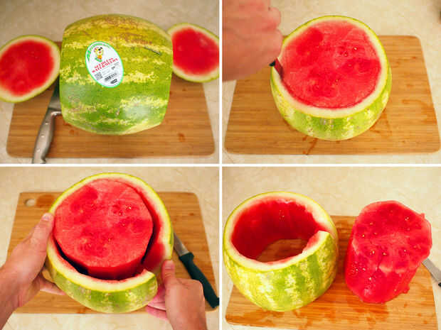 A continuación, cortar la corteza verticalmente para liberar el cilindro de la sandía. Transferencia de cilindro de sandía a un plato y reservar.