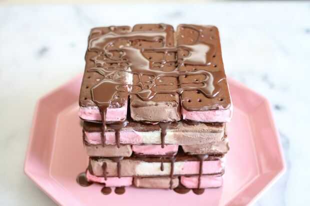 Esta "torta" es fácil de hacer y delicioso! Encontré varios sabores diferentes de sándwiches de helado en mi tienda de abarrotes; chispas de chocolate, vainilla, chocolate y vainilla mezclan.Este es un proyecto de verano para niños ayudar a hace