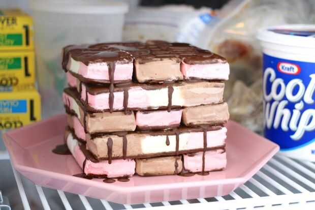 Esta "torta" es fácil de hacer y delicioso! Encontré varios sabores diferentes de sándwiches de helado en mi tienda de abarrotes; chispas de chocolate, vainilla, chocolate y vainilla mezclan.Este es un proyecto de verano para niños ayudar a hace