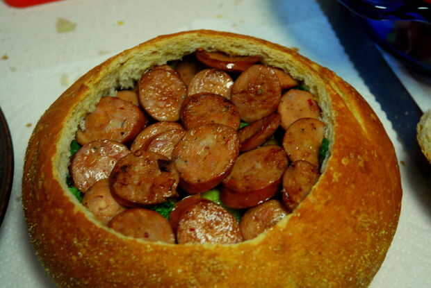 Cubrir el pan con su salsa, y capas de ingredientes. Aquí está mi orden, de abajo hacia arriba:
