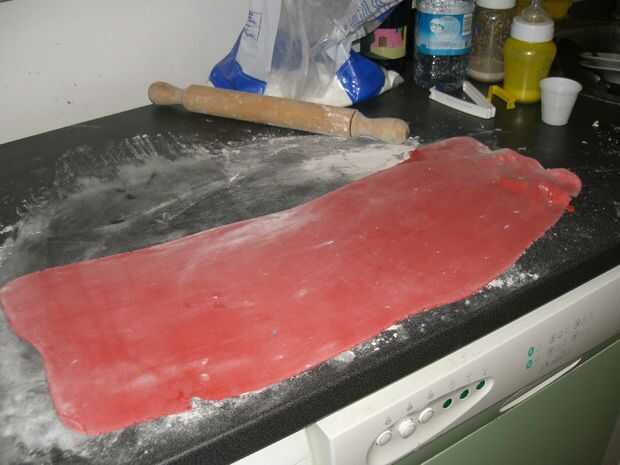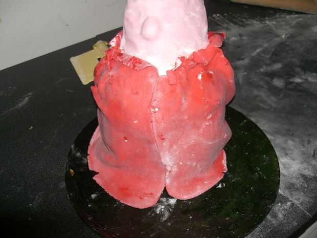 Color el fondant y cubrir su Santa: primero un gran rectángulo rojo de la chaqueta.