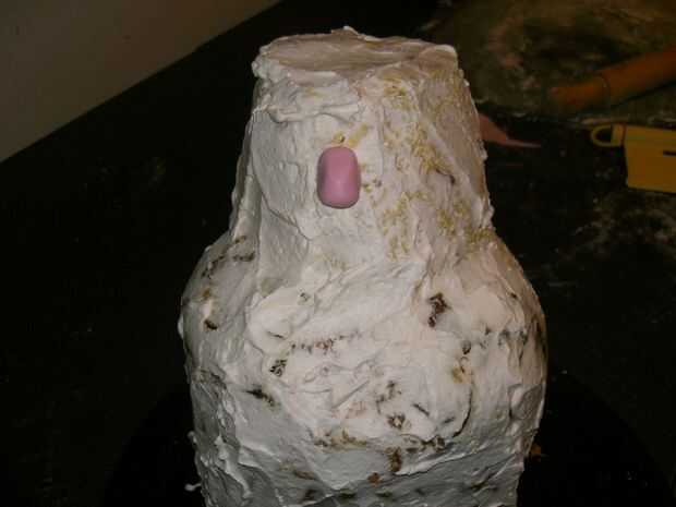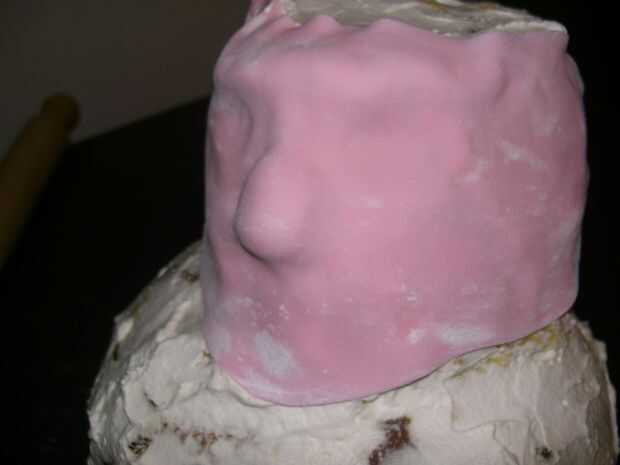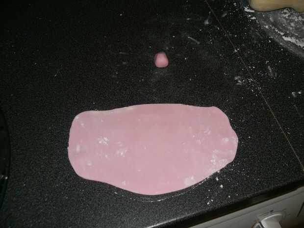 Hacer un triángulo pequeño de pasta de azúcar y ponerlo en lugar de nariz a continuación, hacer un pequeño rectángulo de fondant color rosa para la cara. Cubre toda la cara (con el triángulo pequeño en el centro) y luego presione con el dedo en el lugar del ojo, de manera que tendrá la forma.