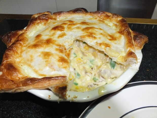 pollo pastel es mucho más fácil hacer lo que crees. Es harina y verduras solo pollo, acción. : DPollo pastel es un buen uso de sopa de sobras de pollo o un pollo asado. Última vez que lo hizo, he utilizado caldo de pollo restante. Esta vez engañado y