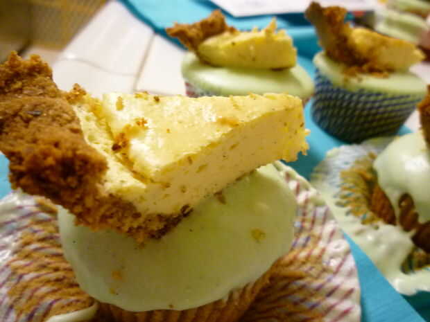 Cortar rebanadas de pastel pequeño y colocarlos sobre las magdalenas.