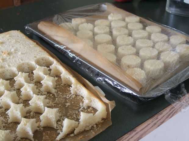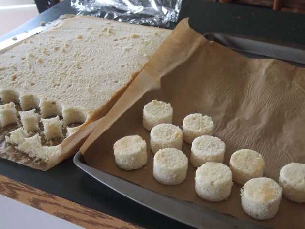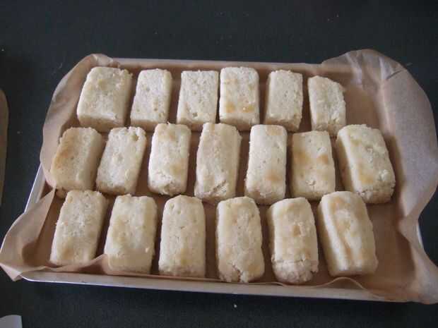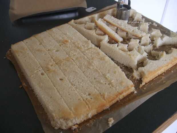 Con el resto de la torta (un tercio, en este caso), utilice un gran ol ' torta o pan de cuchillo de sierra para cortar cuidadosamente rectángulos sobre una pulgada de ancho y dos y media pulgadas de largo. Apriete suavemente cada pieza rectangular en la mano como si estuviera presionando un puñado de arroz, para suavizar la apariencia de bordes duro. Ir poco a poco para evitar que les desmorona.