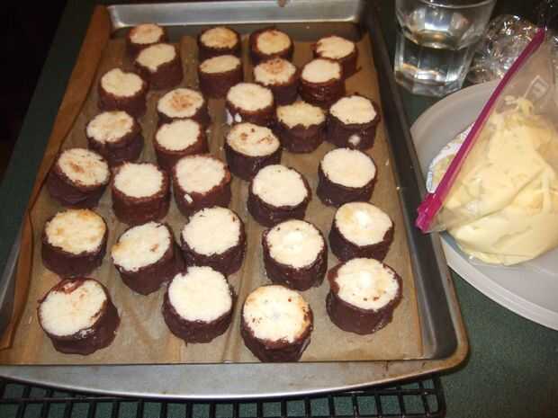 Derretir el chocolate. Tomar tus rondas de almacenamiento en frío y les cubra de chocolate tocando el borde de la superficie del chocolate y girar lentamente la vuelta mientras lo sujeta con dos dedos en el centro, dejando los bordes planos sin recubrimiento. Cuidadosamente retroceder cada pieza sobre la bandeja forrada con y poner en el congelador para establecer.