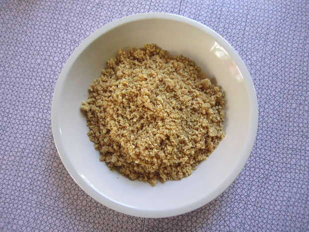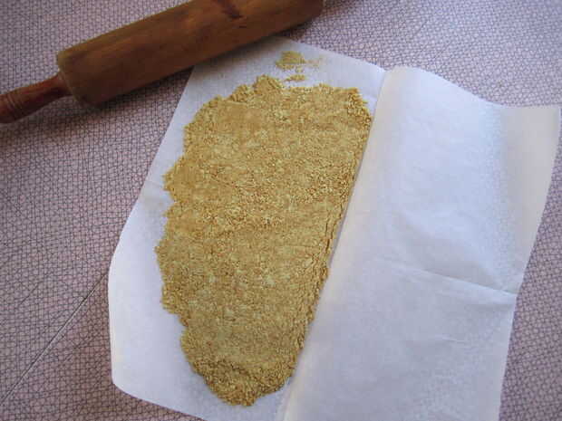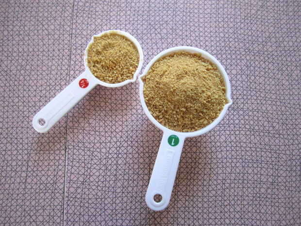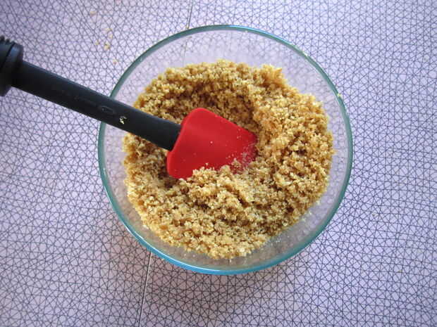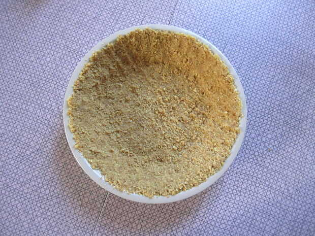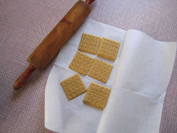 Para obtener 1 1/4 tazas galletas machacadas, utilicé 15 plazas. Tomar un cuadrado grande de papel de pergamino y doblar por la mitad. Poner las galletas dentro y van sobre todo con un rodillo hasta que estén agradable y machacado. Mantenerlo doblado y punta de las migas en la taza de medición. Lo hice en tres lotes.