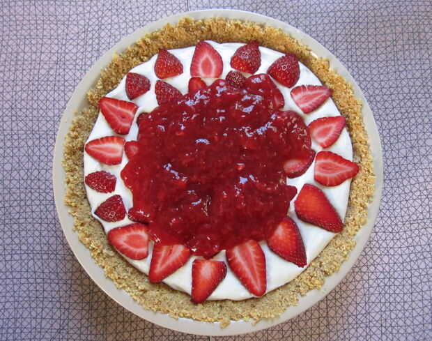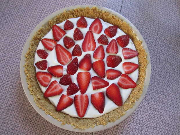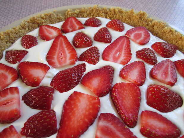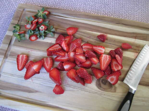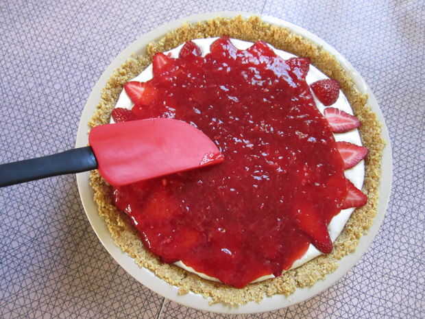 Limpiar y cortar otra taza de fresas y estos Rebane finamente. Éstos se van encima de la tarta con el glaseado. Solo presionan en su lugar dondequiera que usted tenga gusto.