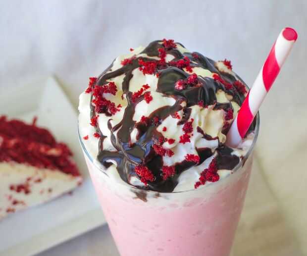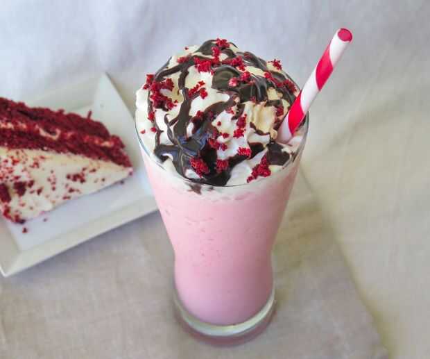 Dependiendo de tu receta, hay mucho que puedes hacer para decorarla. Decidí superior mina con salsa de chocolate y trozos de pastel de terciopelo rojo. Sé rellenar sus bebidas con pastel no es práctico, pero se ve buena.
